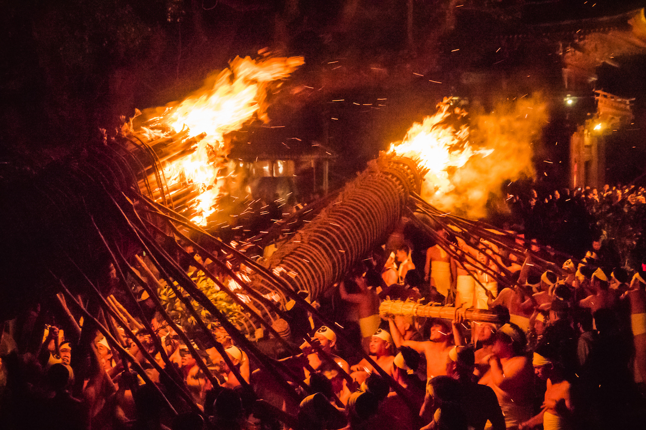 日本一といわれる大松明6本が紅蓮の炎を上げて燃え盛り、それを数百人の裸の氏子若衆がカリマタで支えて境内を廻るという熱気あふれる勇敢な年頭の祭りです。この大松明の火をあびると無病息災といわれ、家内安全、災難消除、開運招福を祈願されるかたで賑わいます。1月4日午前中に大松明を作り、奉納します。